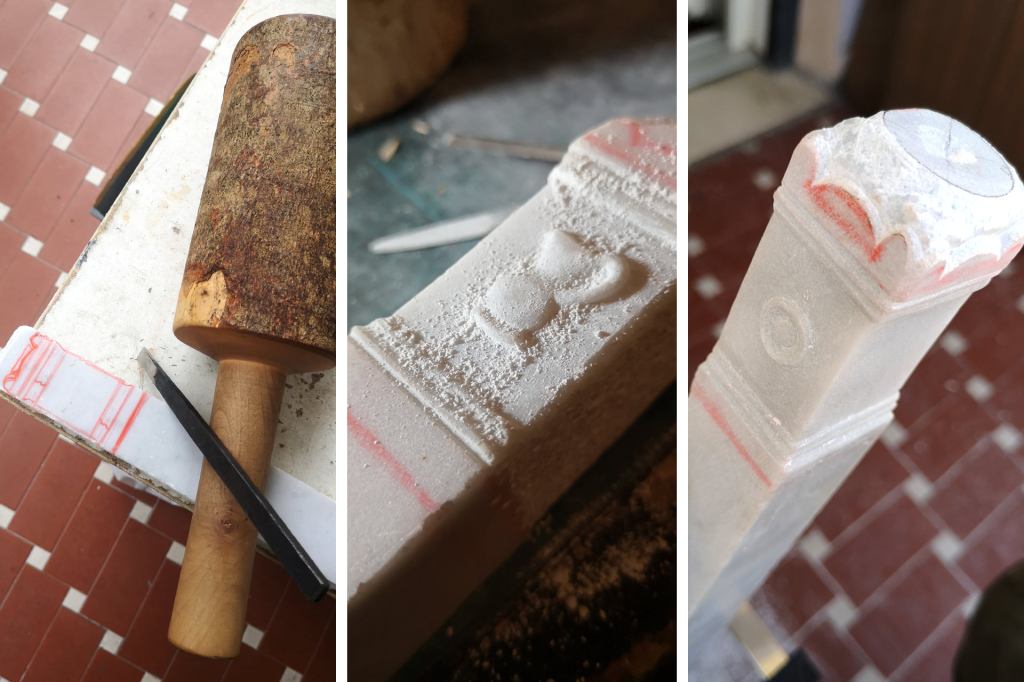 Capolettera P in bassorilievo, con stemma storico di San Paolo flm, scolpito su marmo di Carrara