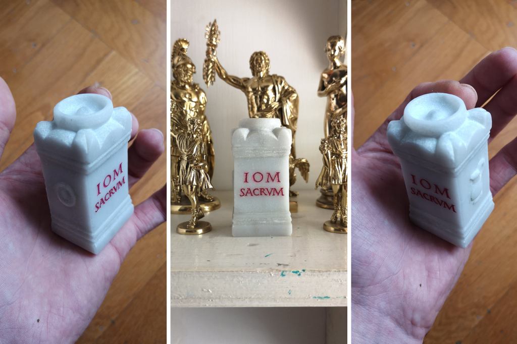 Piccola lapide in marmo di carrara con il nome latino ed un gladio in bassorilievo; in memoria di un amico della rievocazione
