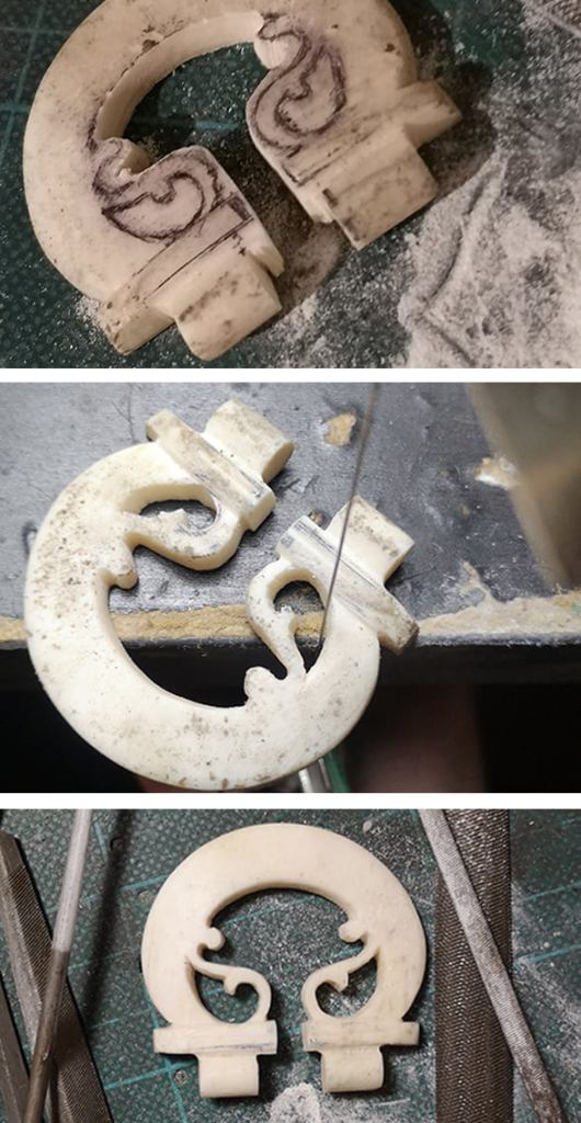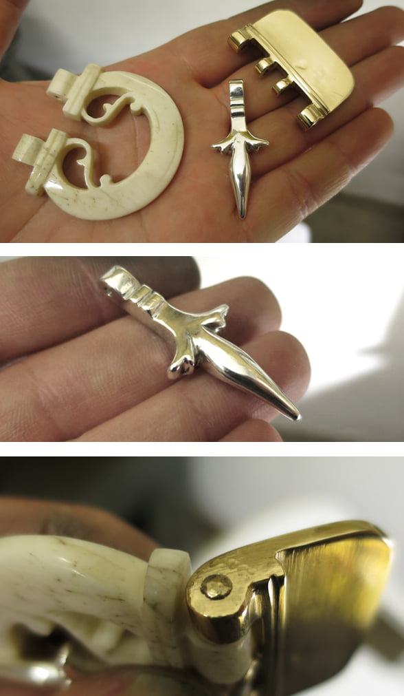 Le parti metalliche fuse e l’assemblaggio con la fibbia in osso
