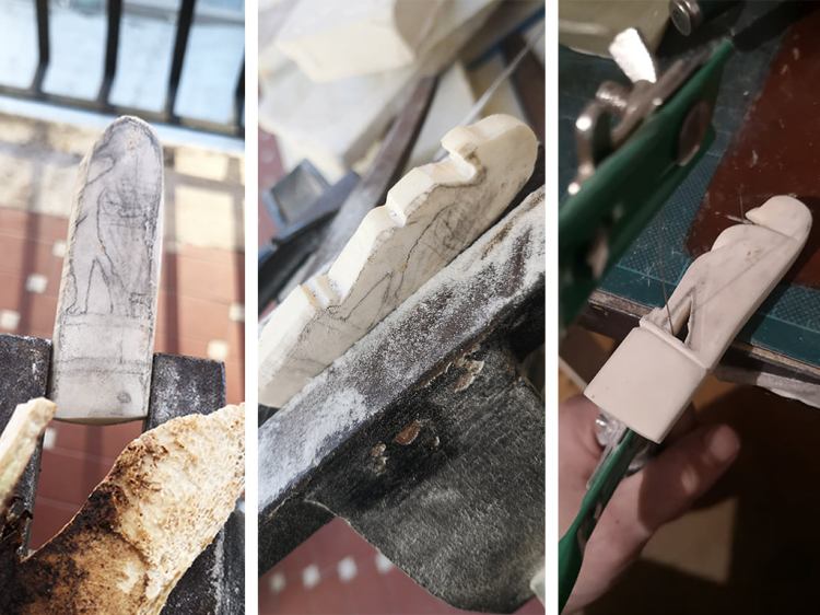 Modellazione manico di coltellino pieghevole in osso, replica di un coltello romano di periodo imperiale dalla collezione Gorga (MNR)