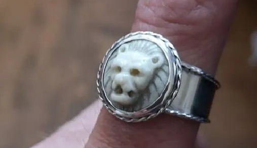 Riproduzione di anello romano in argento di I secolo con cabouchon in avorio intagliato a mano a forma di testa di leone
