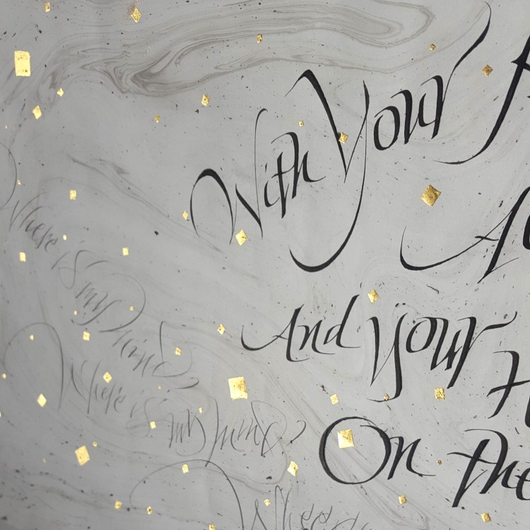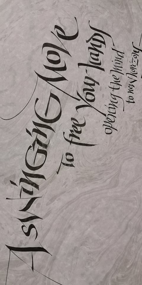 Lavoro in cancelleresca gestuale eseguito su foglio stampato a mano con la tecnica del suminagashi
