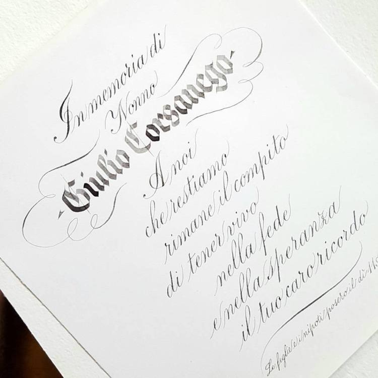 Composizione calligrafica a nero ferrogallico su carta pregiata in cancelleresca espressiva realizzata a punta fine