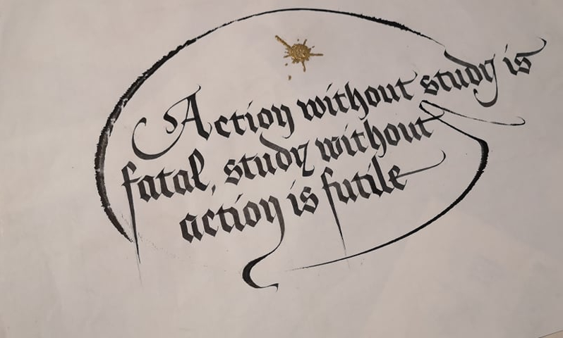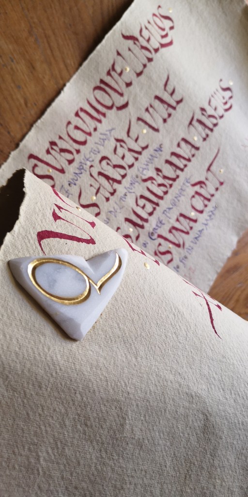 Dettaglio di capolettera inciso e dorato su marmo di carrara attaccato ad un lavoro su carta cotone pregiata