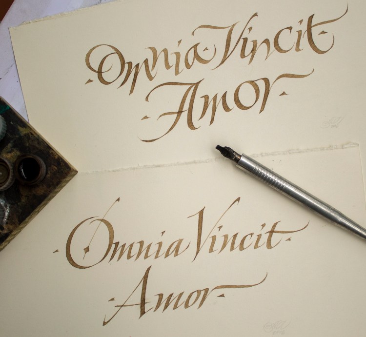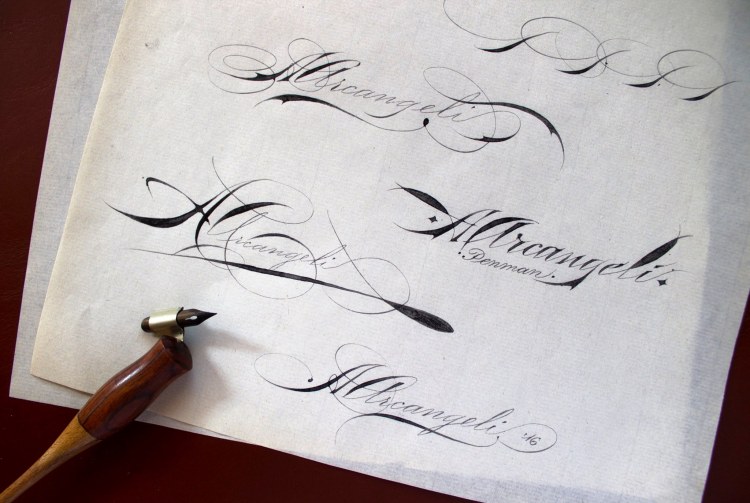 Firme in Ornamental Penmanship ed in varie versioni moderne realizzate con portapennino obliquo e pennini d’epoca a punta flessibile