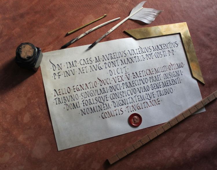 Riproduzione ipotetica di pergamena imperiale massenziana, capitalis rustica scritta a penna d’oca, rosso di robbia e ferrogallico su pergamena caprina