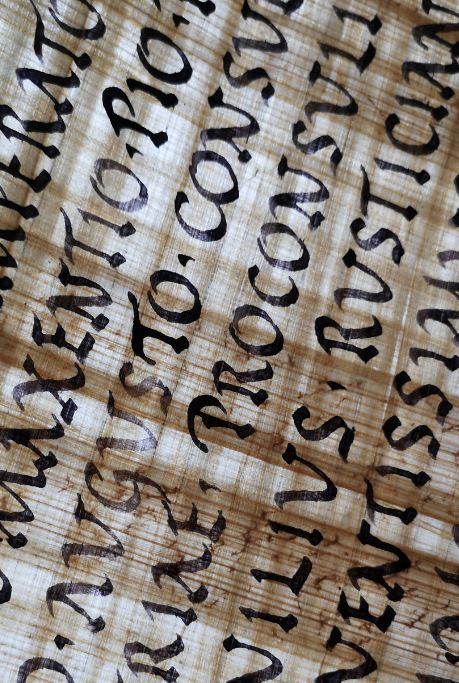 Capitalis rustica realizzata a calamo e ferrogallico su papiro- traslucenze