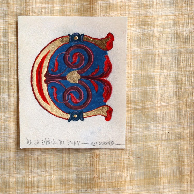 RIproduzione di capolettera E dalla Bibbia di Bury, foglia oro e pigmenti su pergamena ovina