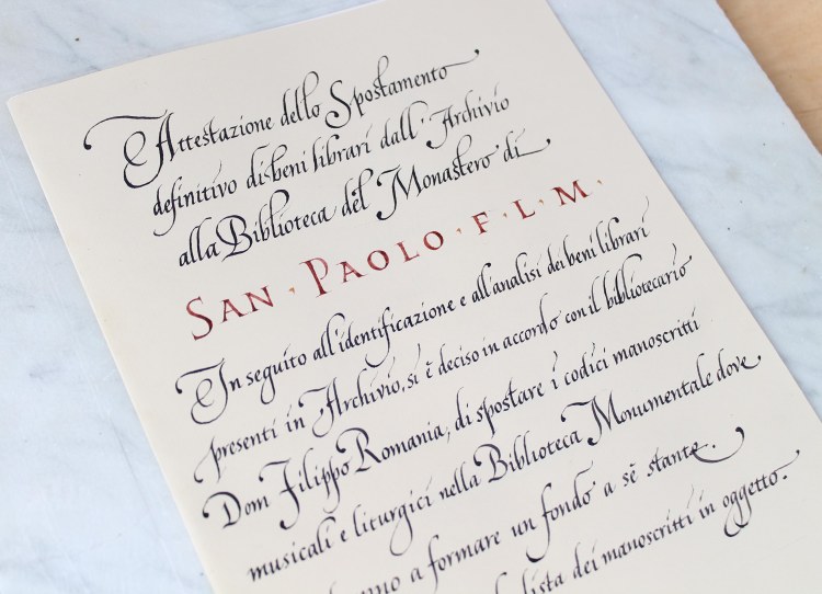 Documento interno per l’Archivio di San Paolo fuori le mura, realizzato in cancelleresca, con delle lettere capitali a far da intestazione centrale. Penna d’oca, ferrogallico e rosso di pernambuco