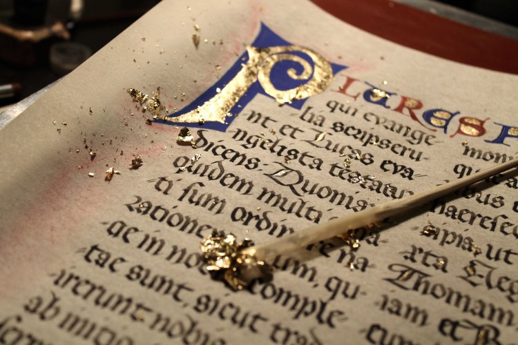 PLURES FUISSE – intestazione in foglia oro e pigmenti, testo in gotica rotunda con tocchi di foglia oro nei capolettera calligrafici. Realizzato con strumenti e colori del tempo, ossia penna d’oca, pigmenti e inchiostro ferrogallico