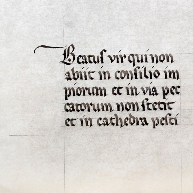 Testo sacro in gotica rotunda, copiato su pergamena, rigatura a fil di piombo, penna d’oca e ferrogallico