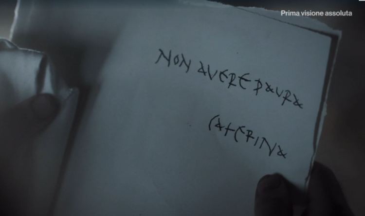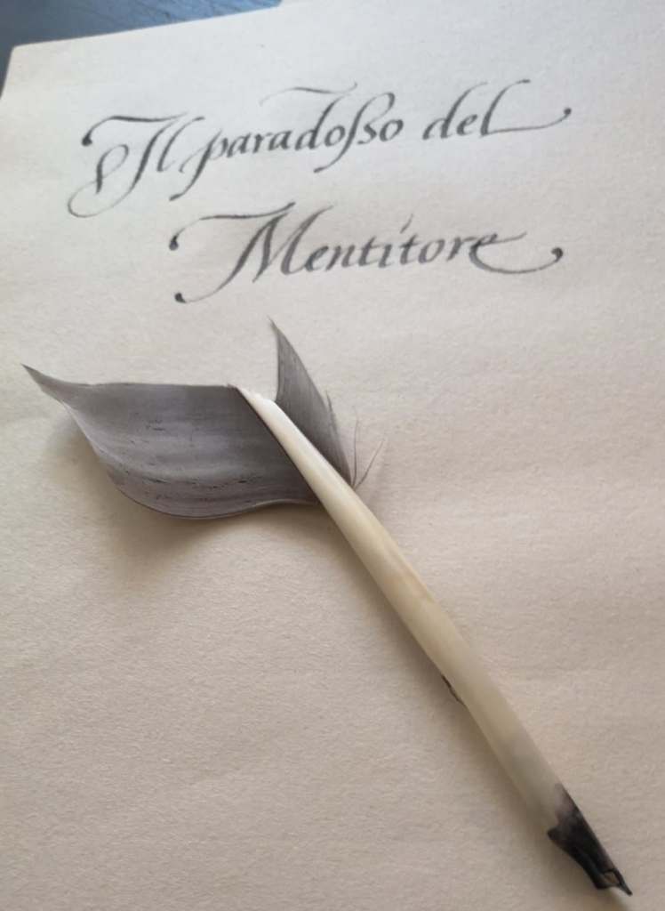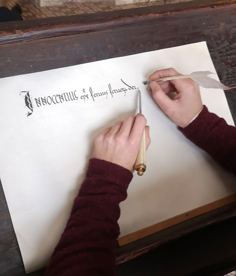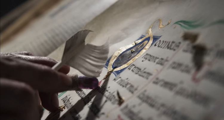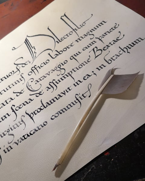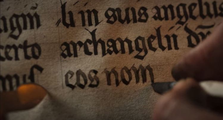 Calligrafia carolingia con capolettera decorativi per un film su Caravaggio