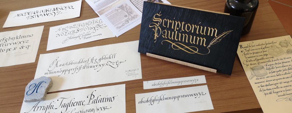 Tavolo del docente, selezione di lavori, corso sulla Cancelleresca – Scriptorium Paulinum 2019