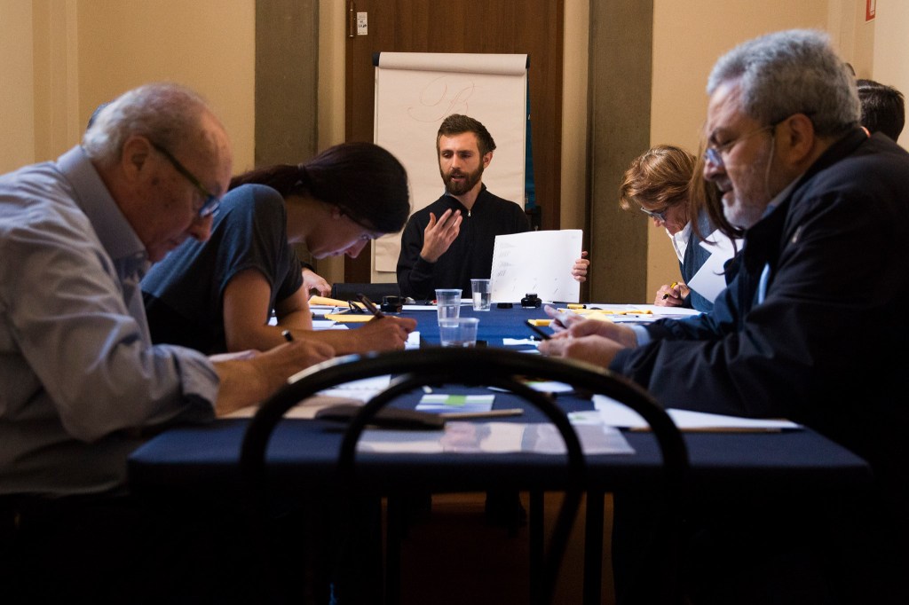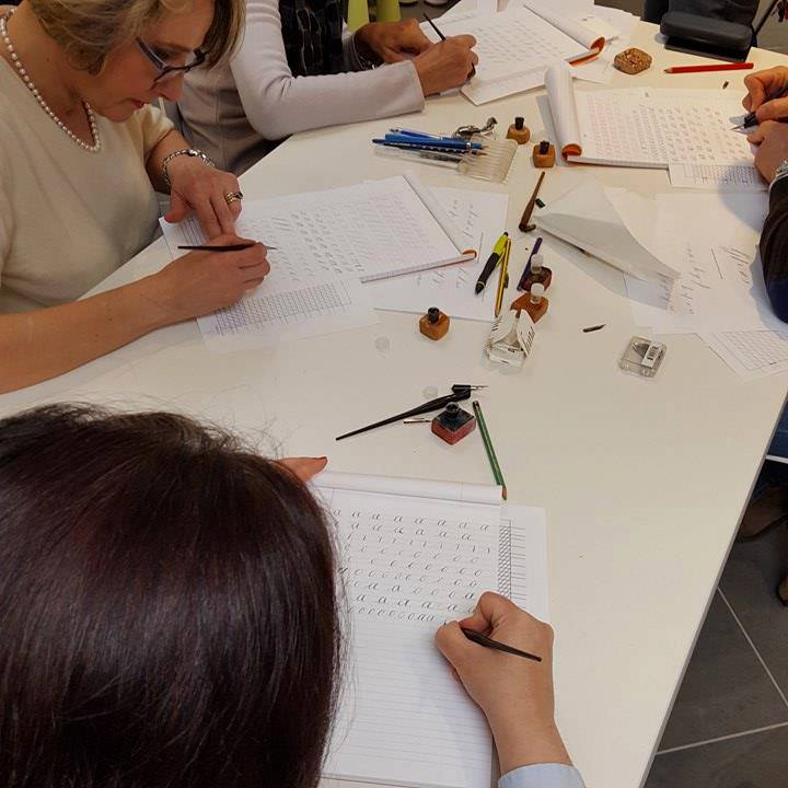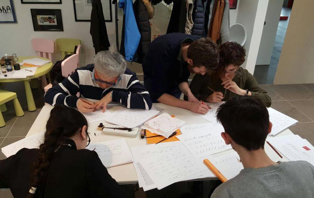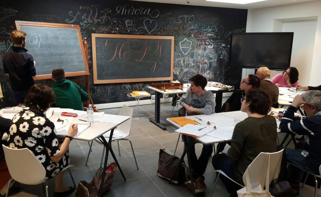 Alunni all’opera, corso di corsivo inglese per la Aurora penne stilografiche a Torino, 2017