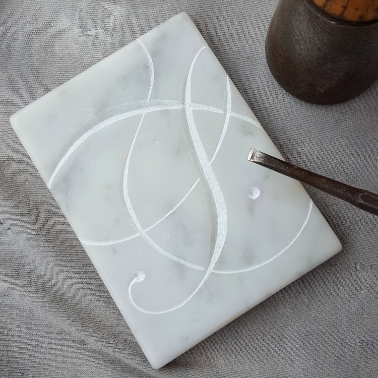 Dopo aver praticato la bella scrittura per diversi anni, ho trovato il marmo come supporto più affine alle mie progettazioni calligrafiche nate con gesti delicati di pennino su carta ed incise a scalpellate su pietra. Di seguito viene presentata una raccolta di lavori incisi a martello e scalpello, spesso smaltati, a volte lasciati a nudo, a volte dorati in foglia oro, sulle più diverse qualità di pietra.