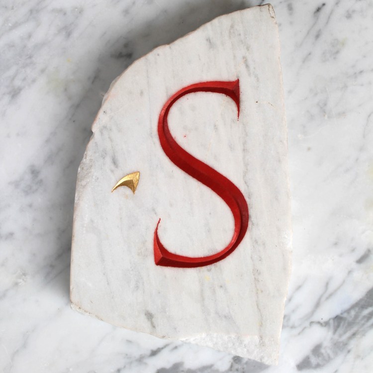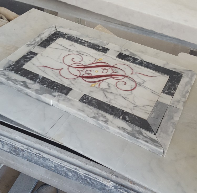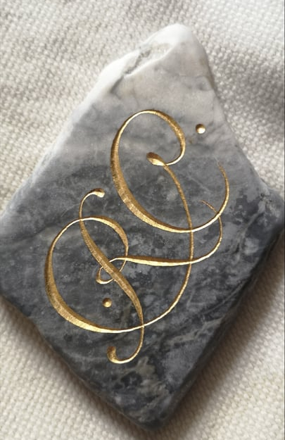 Monogramma calligrafico dipinto, intagliato a V e dorato in foglia oro su frammento di marmo