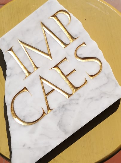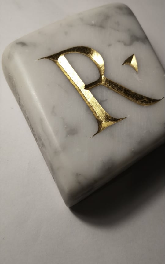 Capitalis Monumentalis R intagliata a V e dorata in foglia oro 24 kt su marmetto di Carrara Levigato