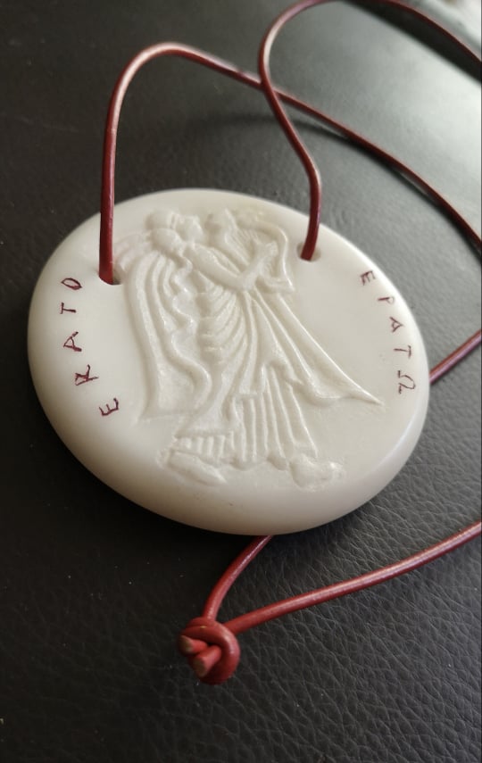 Medaglione con bassorilievo della musa Erato, in marmo bianco di Carrara, lettere smaltate in rosso pompeiano, finitura in cera