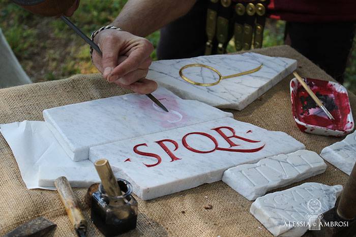 Lapide in stile romano realizzata seguendo formulazioni di età imperiale, intagliata a V su marmo di Carrara. Smaltatura in rosso (come plausibilmente dovevano apparire le iscrizioni romane appena realizzate), lavoro in memoria di un amico della rievocazione