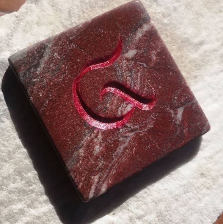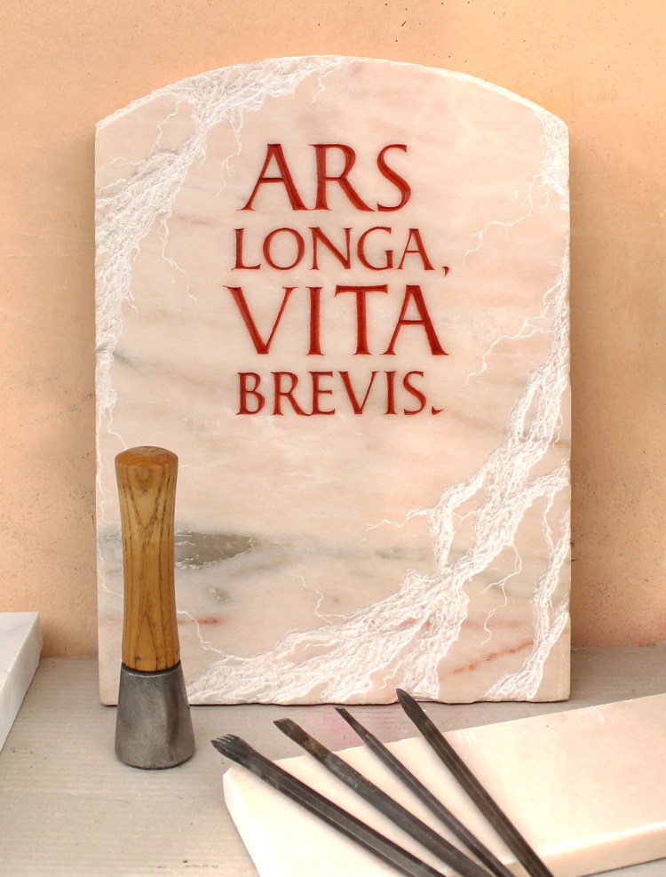 Pathos- corsivo inglese inciso su marmo di carrara, smaltato in rosso