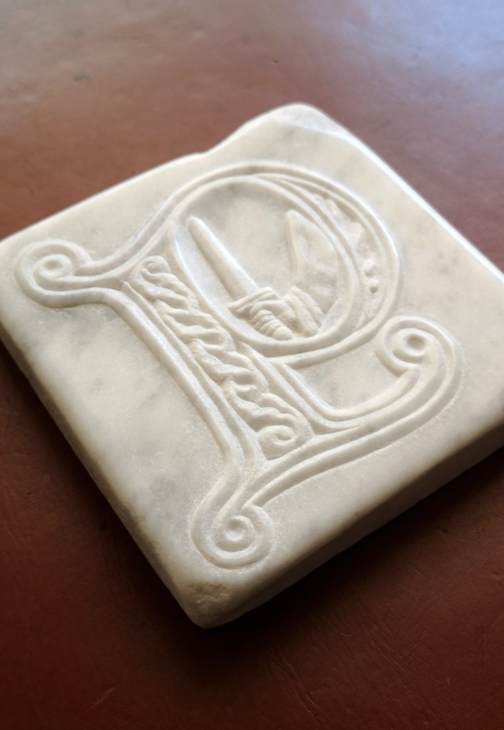 Capolettera P in bassorilievo, con stemma storico di San Paolo flm, scolpito su marmo di Carrara