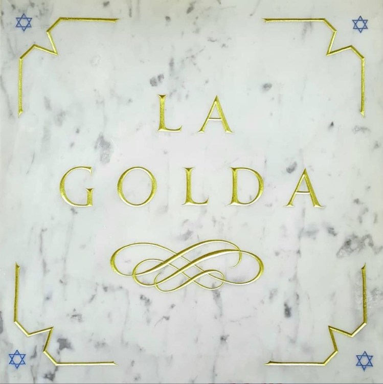 LA GOLDA – iscrizione per l’ingresso di una sontuosa villa, incisa a V su marmo di Carrara, smaltata e dorata in foglia oro 24 kt